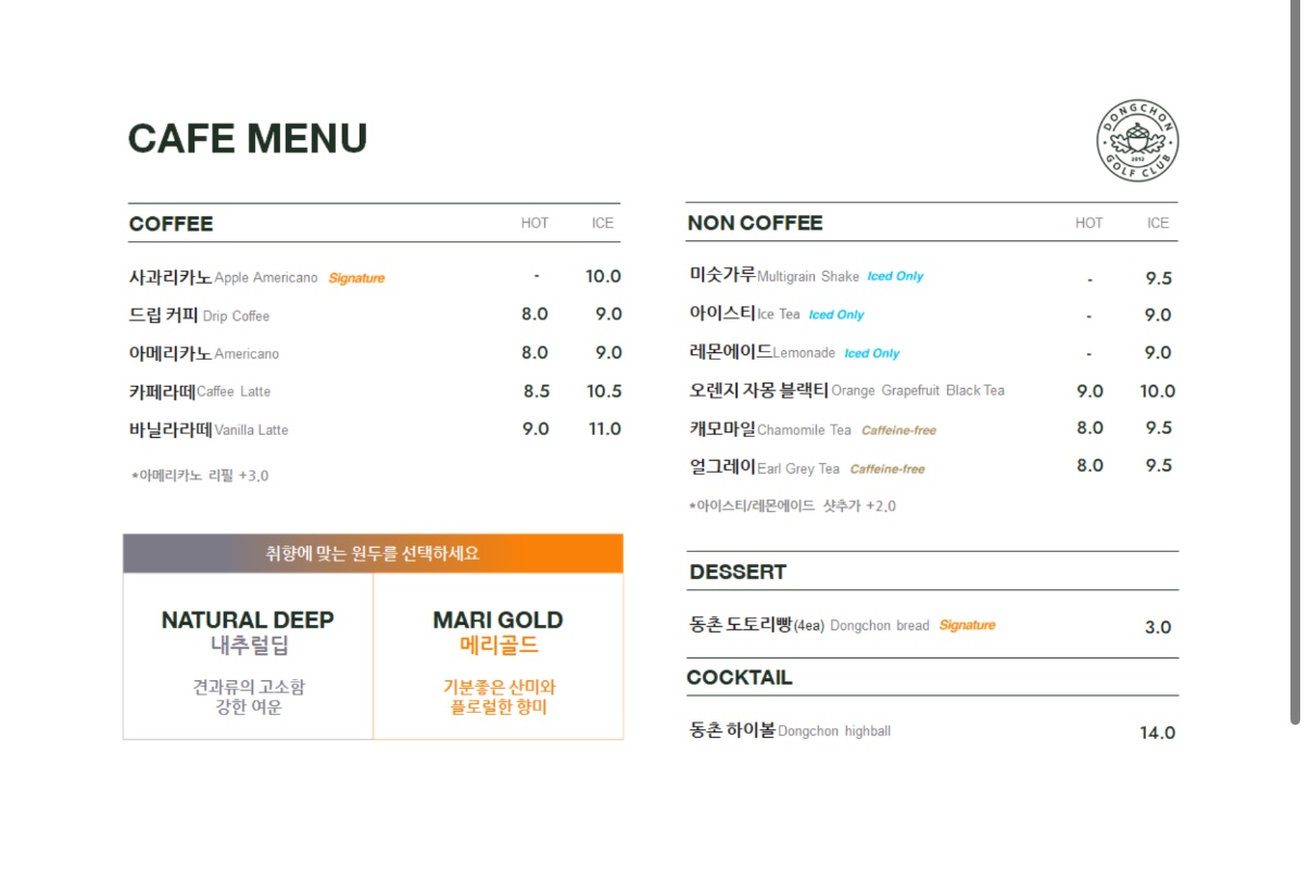 라운드를 특별하게 만들어줄 스페셜 티 2종과다양한 음료가 준비되어있습니다.